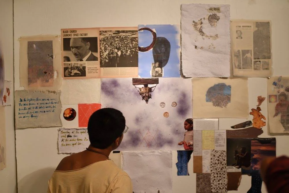 "...to take root among the stars" is an adjustable paper mural in progress that chronicles evidence of the preoccupation of space travel and mysticism in the black imagination from the 1940s until the present. The mural engages mixed-media on and in paper, vintage magazine articles, quotes, passages from books, and other printed matter that address or allude to what has come to be described as Afrofuturist or Afrosurrealist.